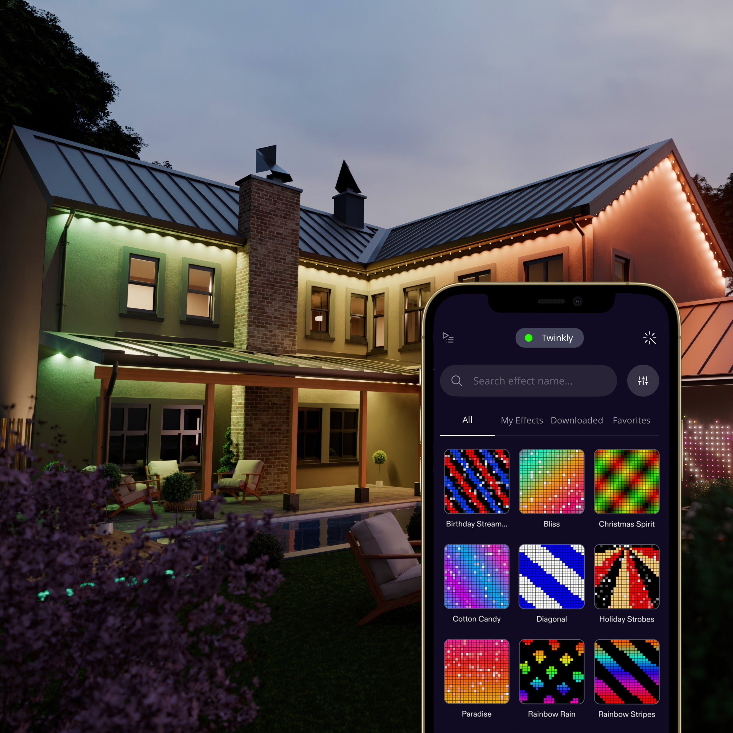 Les Permanent Lights Twinkly brillent avec une vibrance exceptionnelle en plus de 16 millions de couleurs sur toitures, avant-toits, clôtures ou allées pour une décoration extérieure personnalisable toute l’année.