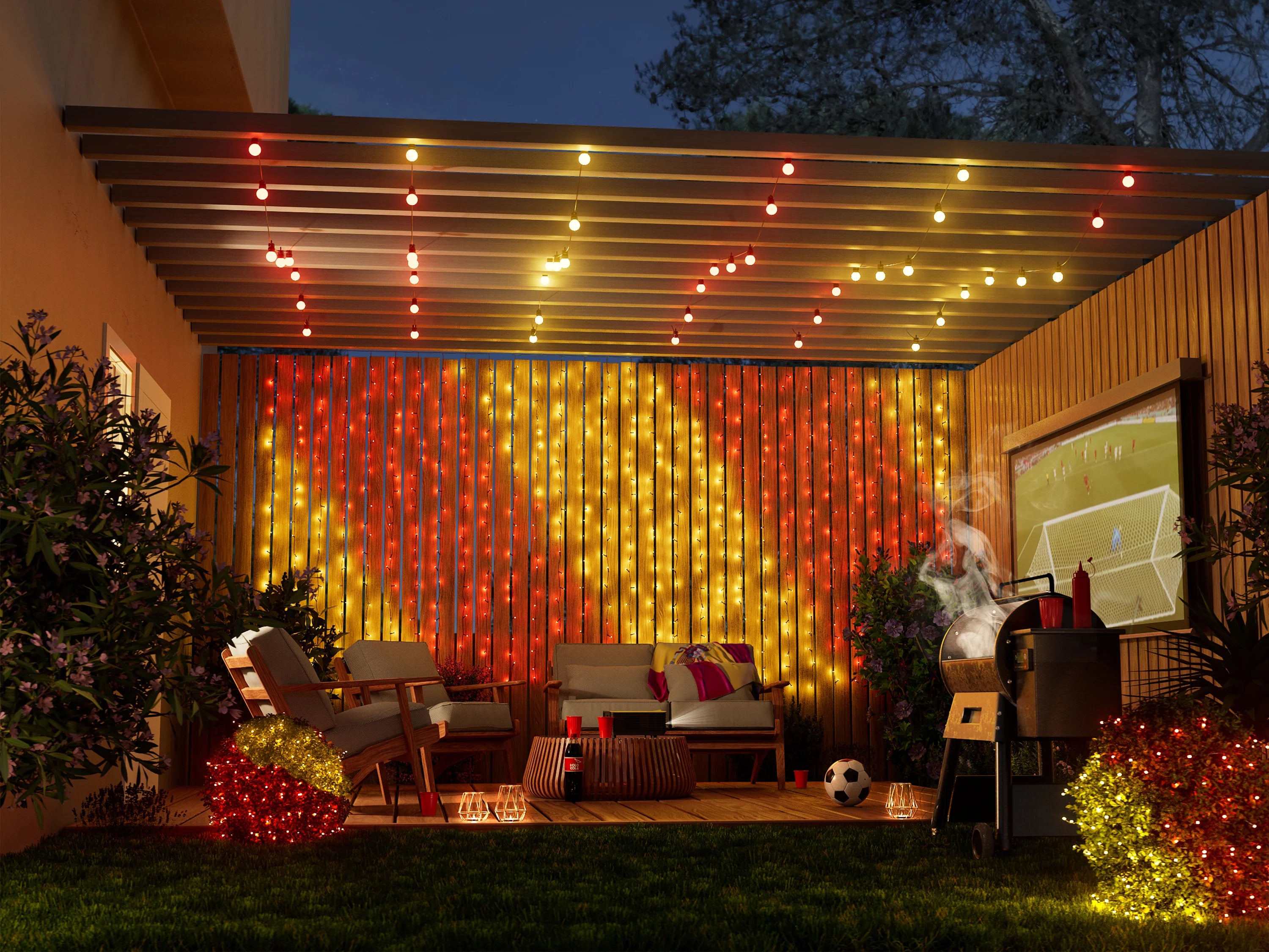 Create an unforgettable outdoor Christmas display. Decorate windows, roofs, bushes, and large trees with Twinkly smart lights, and group them to shine as one spectacular light show.